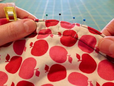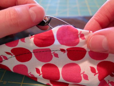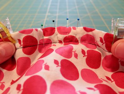 The hardest part is sewing the gap together once the elastic is in and is bunching the fabric! Flatten the area as best you can, pushing the bunched material away from the gap are. Also make sure to rotate the spot where you've sewn the elastic together to a different place in the cap circumference so as not to add an added bunch right at the gap. Using pins or mini quilting clips, hold the elastic in place.